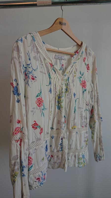 Очень нежная лёгкая блуза в хорошем состоянии. Есть микро точка, на фото отметила и строчка немного распуспустилась. Размер эль.