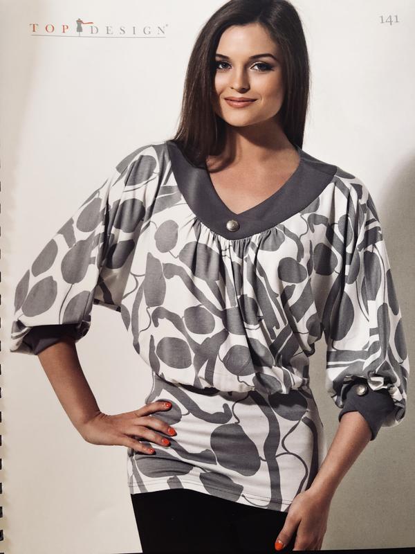 Блуза трикотажная. Рукав 3/4. Состав 94% вискоза,6% эластан. Размеры 46-48,48-50,50-52,52-54.