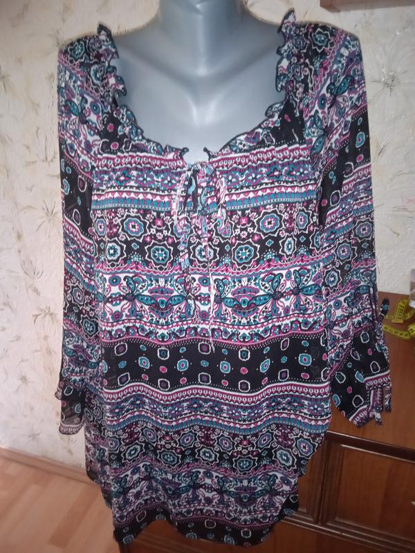 Размер на фото 2-3, смотрите замеры. Состояние отличное, без дефектов. Ткань шифон, 100% полиэстер. Есть подкладка 100% полиэстер. длина от верхней точки плеча к низу 75. длина рукава от плечевого шва 55. п/о бицепса 26. п/о груди (измеряла по шифоновой блузке, максимально разложив все сборки) 73. п/о талии 72. п/о внизу 77. 43