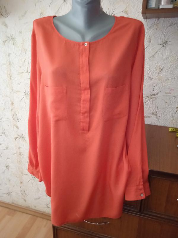Евро размер 46, смотрите замеры. Яркий коралловый цвет, ближе к реальному на фото 3. Ткань тонкая, не тянется, вискоза/полиэстер. Состояние очень хорошее, с изнаночной стороны есть зацепки внизу, с лицевой все отлично длина от верхней точки плеча к низу впереди 78. длина от верхней точки плеча к низу сзади 82. длина рукава от плечевого шва 62. п/о бицепса 19. п/о груди и талии 60. п/о внизу 61. ширина между плечевыми швами 44. 43