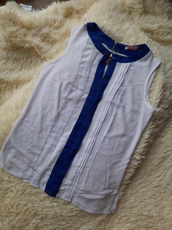 Красивая белая майка-блузка. Подойдёт как под деловой, так и под прогулочный стиль. По бокам есть разрезы. На теле смотрится свободно. Размер S/М Состояние отличное.