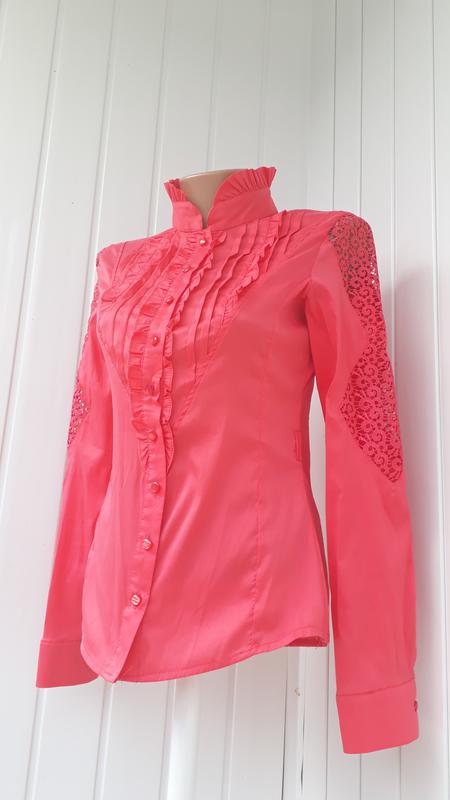 Красива блузочка в діловому стилі, декорована кружевом макраме, розмір 48, стан нової, колір кораловий, матеріал стрейч.