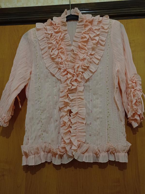 Блуза, ткань жатка, немного просвещается, размер 50-52, цвет бледно-розовый, застегается на пуговицы под рюшем. Практически новая, одевалась пару раз.
