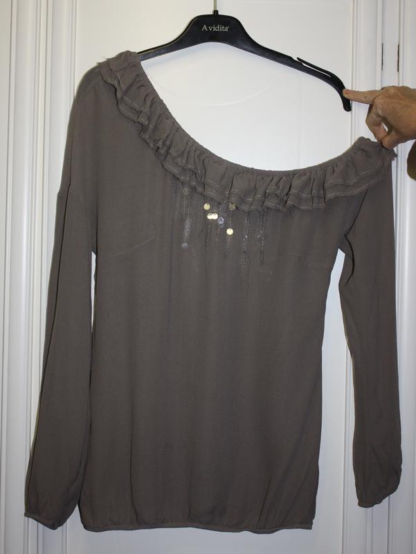 Дымчатосерая. Асиметричну верх, на одне плече. Верх на резинке, вниз на резинке. Замеры : ПОГ 46см, ПИТ 44см, ПОБОДЫ 49см, длина 67см.