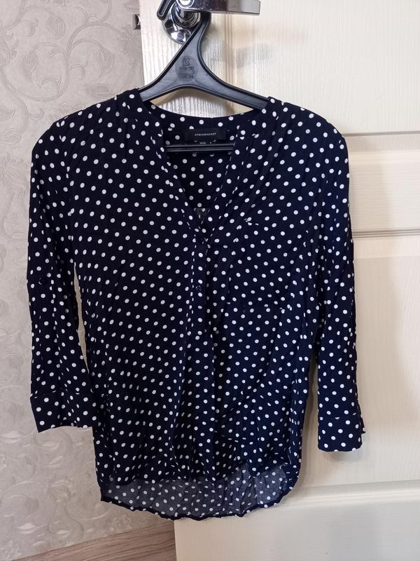Блуза в идеальном, новом состоянии. Состав 100% вискоза. Цвет синий в белый горох. Спинка длиннее, рукав регулируется. Размер 8(36). Хорошо будет на S-M. Если есть вопросы-пишите. Возврата нет.