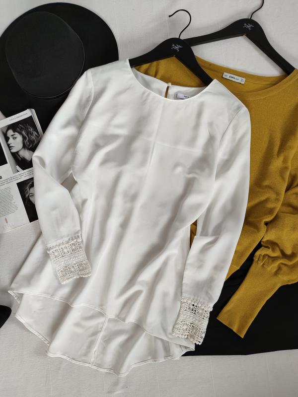 Подовжена біла блуза від Mango вільного крою з красивими рукавами, тканина поліестр, розмір вказано L, ПО грудей 53 см, довжина 65 см