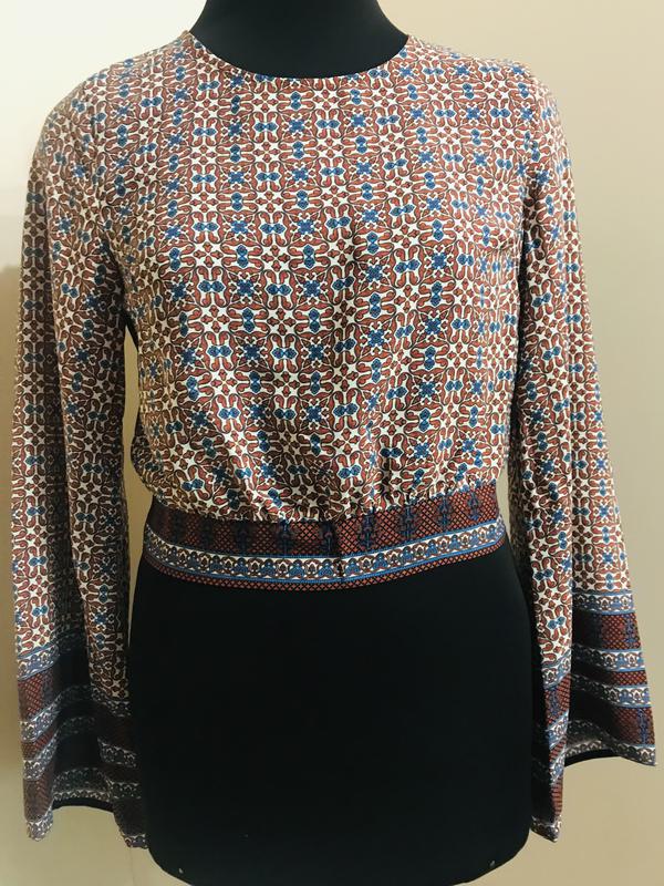 Укорочённая блуза/топ сзади бант . Купонный принт. Размер указан S/P Одевала на 36/38 Состояние идеальное, дефектов нет Длина по спинке 43 см, рукав от плеча 61 см, ПОГ 48 см, ПОТ 34 см, фиксирует бантом .