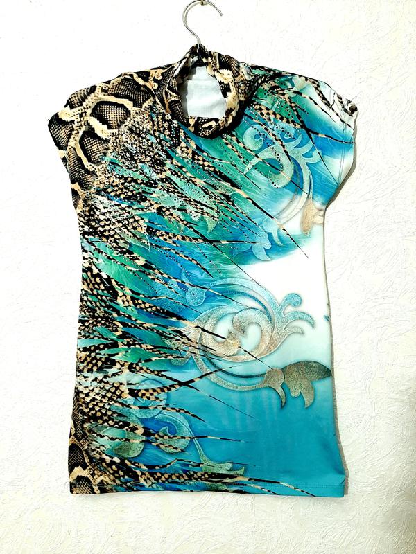 Дуже красива кофтинка з високим комірцем еластична стрейчева, блакитна, кольорова, змія принт, термострази чорні і золоті. Бренд Miss mommy. На розмір 44, 46. Склад 95% віскоза, 5% еластан. У відмінному стані. Виміри: довжина спереду від початку плеча 63см, ширина 2-х плечей 47см - плечі приспущені, стиль японка, по лінії грудей 72см + розтягується, по лінії стегон 84см + розтягується. Завжди порівнюйте дані тут виміри з вашим одягом та розмірами.