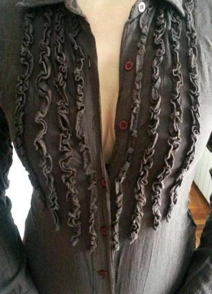 Коричневая тоненькая блузка с красивым декорированием на груди в виде небольшого жабо. Приталена. Ткань слегка жатая. Подходит как под джинсы, так и под офисный костюм.