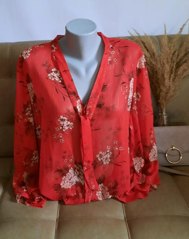 Оригінальна жіноча блуза під шифон. Хорошої якості, легенька в квітковий принт. Дуже нарядна на зав' язку. Стан нової. Розмір на бірці: UK 22. Заміри: ПОГ: 68 см. Плечі: 43 см. Довжина блузи: 69 см. Довжина рукава: 49см. Доставка: Висилаю через Нову Пошту, Укрпошту та Justin за рахунок отримувача після100% оплати на карту Приватбанк