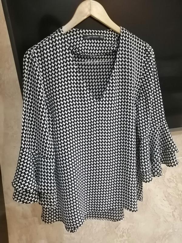 Цікава легенька блузка, стан нової ( не підійшов розмір), бірки відрізали. Рукав 3/4 рюшки. перед чуть коротший за спинку. Тканина віскоза, не тягнеться. Заміри: ПОГ 51 Рукав 46 Довжина перед 63, спинка 70(максимально)