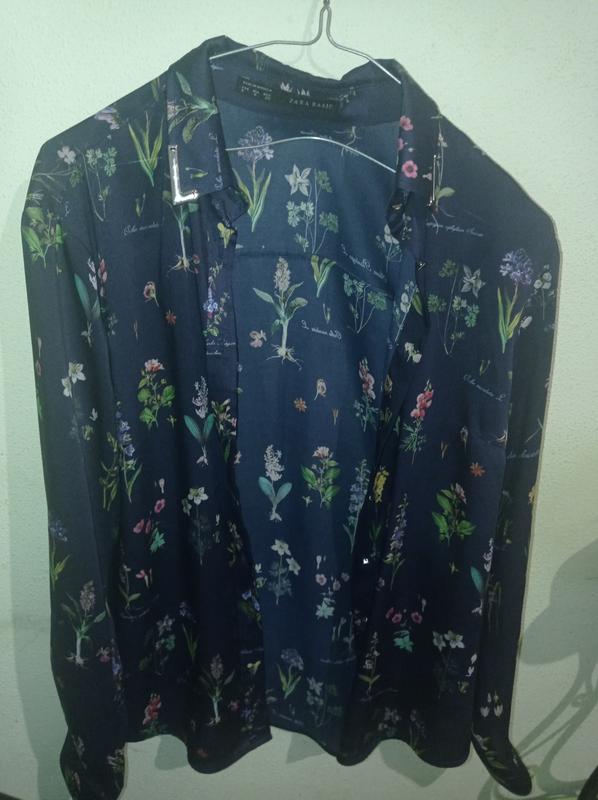Темно-Синяя блуза Зара с цветочным принтом.Размер S-M.Полуобхват груди -49 см. Полуобхват талии-45 см, длина спереди 65 см, длина сзади 67 см. Длина рукава 60 см. Плечи 37-38см .