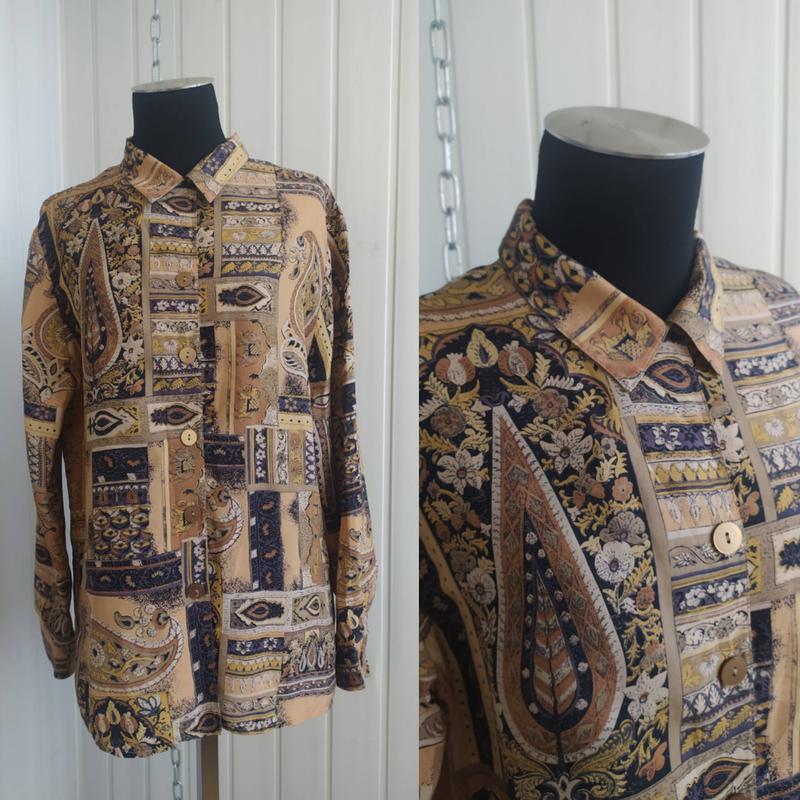 Рубашка со стильным принтом, актуального прямого кроя. Пуговицы застёгиваются воротник. Очень элегантно и стильно. Разрезы по бокам и низу. 100% купрo. UK 12, EUR 40. Длина 72 см, длина рукава 59 см, ширина под руками 54 см, плечи 42 см. Ткань холодящая, очень приятная к телу. Отправка Новой Укрпочтой Justin по предоплате.