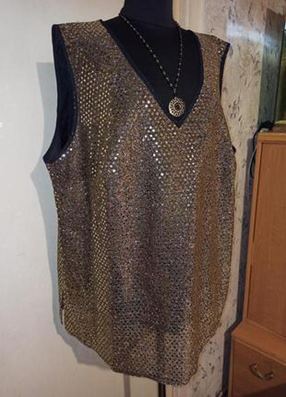 Нарядный-вечерний,яркий "золотой",топ-блузка-майка,большого размера.Размер на бирке Gb22/24,D/Nl 48/50, но ориентируйтесь по замерам,снятым по внутренней чёрной майке-блузке-не тянется: длина туники от верха бретели-71см,боковой шов 43см, ПОГ (от подмышки к подмышки) 61/63 см + есть выточки, ПОБ,по канту- 66см + есть разрезики 11,5см,ПО проймы 29см. Одета пару раз. См.др.мои объявления-есть аналогичные куртки,пиджаки и много одежды большого размера. Подписывайтесь на мою страничку-очень много одежды больших размеров-почти каждый день обновления. Переспрашивайте,сделаю дополнительные замеры и фото.Возврата нет-объявления платные. Покупая несколько товаров-Вы экономите на пересылке, покупая три лота-пересылка за мой счёт. Просьба: перед покупкой ознакомиться с рубрикой "ОБО МНЕ" Состав: 60% полиамид,40% netallisierendes Garden Lurex,полиэстер Доставка: Перешлю в др.города-за Ваш счёт-при полной оплате на карточку