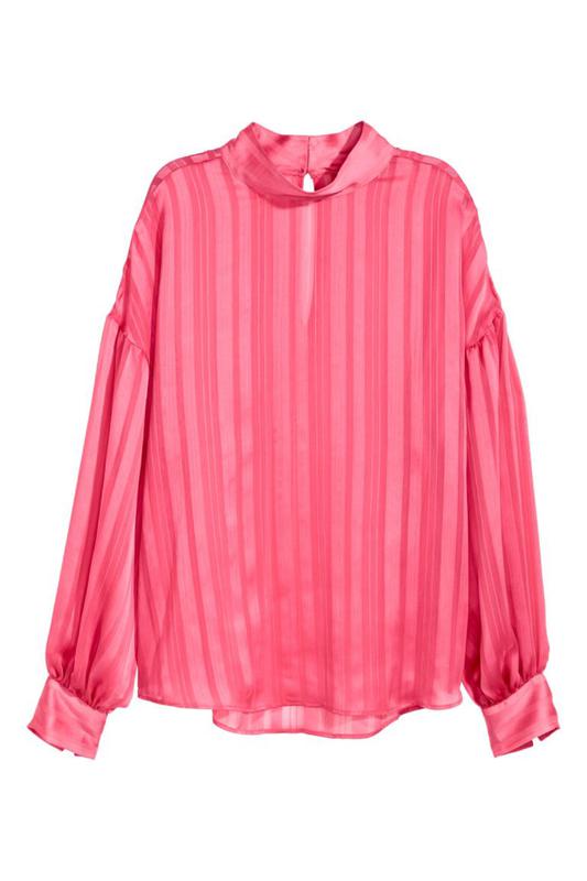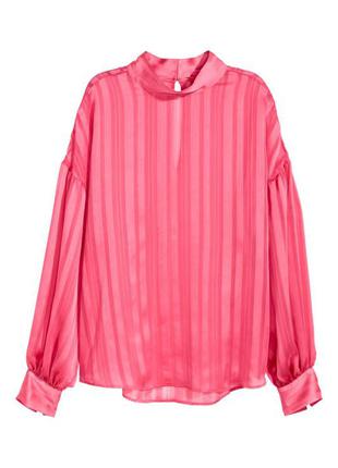 Блузка прямого покроя из воздушной, рельефной ткани в полоску C воротничком-стойкой и вырезом,на пуговице сзади сверху. Заниженная линия плеча, длинные широкие рукава с манжетами на пуговице и слегка скругленным низом. Слегка удлиненная спинка. Оверсайз