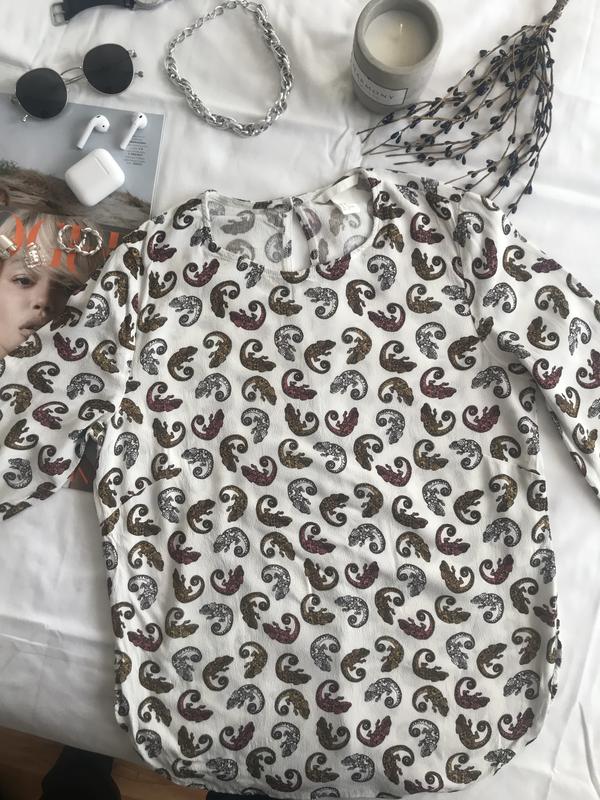 Легенька і приємна до тіла блуза в принт - хамеліони) Блуза подовжена (можно заправляти), прямого крою, рукави 3/4 Тканина легка, на тілі не відчувається, не просвічує Стан нової речі Написан розмір 38/М, але краще на меньший, на маленьку S