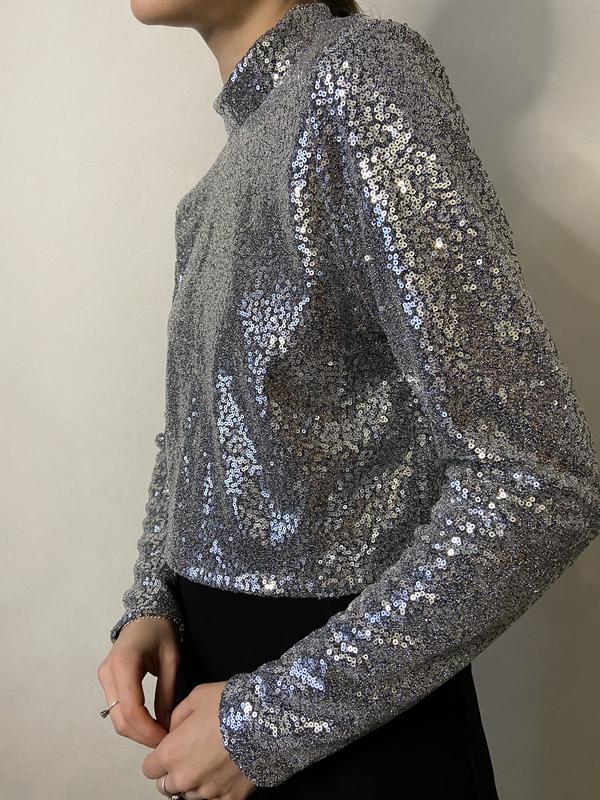 Невероятный топ в пайетки Размер XS-S Плечи 36 ПОГ 44 Рукав 60 Длина 42 Параметры на фото 81-64-91, рост 165 см