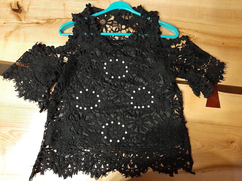 Шикарна літня блуза з відкритими плечима та круглою горловиною. Мереживо цупке, в ідеальному стані. Перлинки пришиті. Виріб йде в комплекті з маєчкою. Параметри: довжина 55-57 см, по спинці 58-59 см, пог 46-47 см.