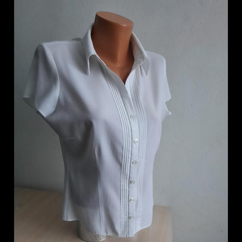 Белоснежная блуза с воротничком на короткий рукавчик. В идеальном состоянии. Плечи 37 ПОГ 51 ПОТ 44 Низ ширина ПО 51 Длинна 59 Рукав 14