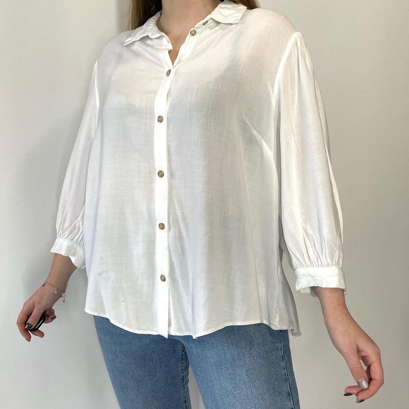 Легка блуза George Стан 4/5, є рваності. Якщо заправляти, зовсім не помітно Розмір 16 ххл-хл (орієнтуйся по півобхват замірам) Під руками 59 Довжина 58/68