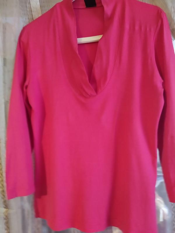 пог 48 см ,поб42см, длина от плеча 57 см, длина рукава 40см(см фото 4- пятнышко),ярко розовая ближе к фуксии,V-образный вырез