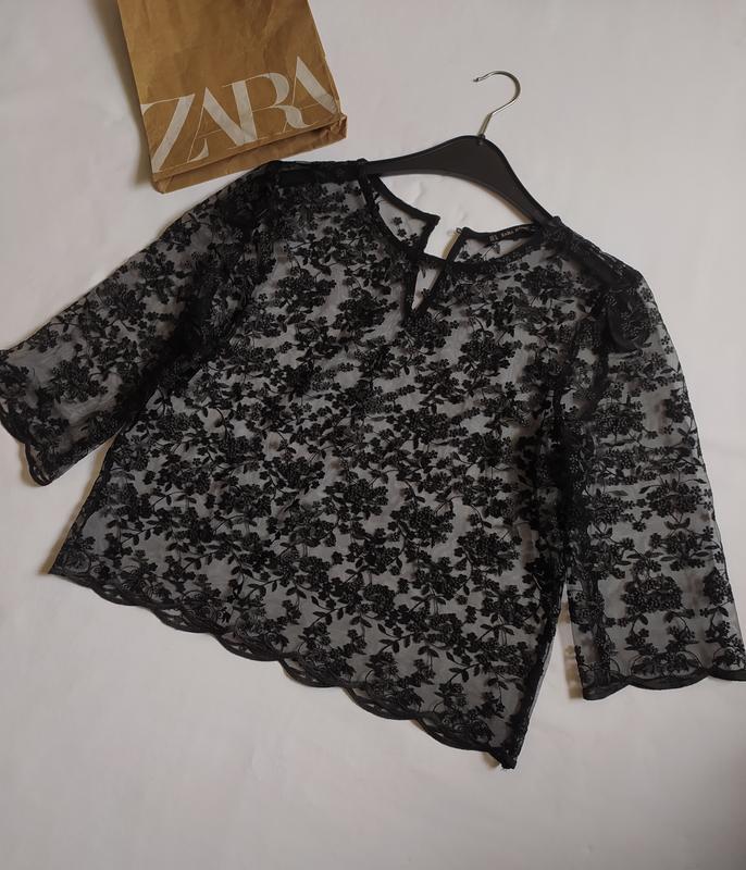 Дуже гарна прозора блуза вільного крою оздоблена вишивкою Zara розмір M. Нова без бірки, в ідеальному стані без дефектів . Тканина синтетична, просвітлює, не тягнеться. Заміри грудей 48 см, низ 50см, довжина від плеча 50см.