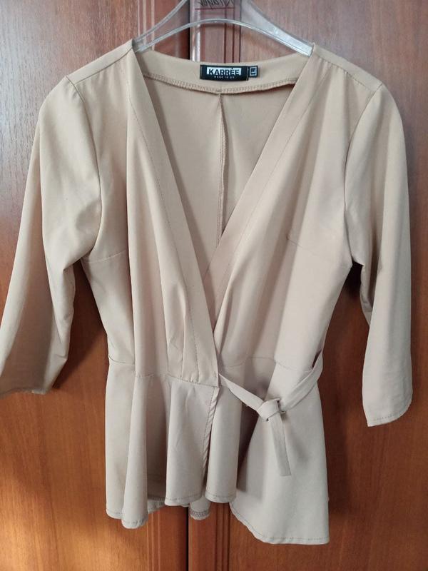 Блуза ,Karree,цвет бежевый,песочный.Модель "на запах",имеет внутреннюю пуговицу на поясе.а также снаружи-поясок. пог-около 40 (из-за кроя "на запах" сложно измерить с точностью до см,т.к. зависит от того,как ее разложить), пот-38,длина рукава от плеча-40,ширина рукава в нижней части-12.