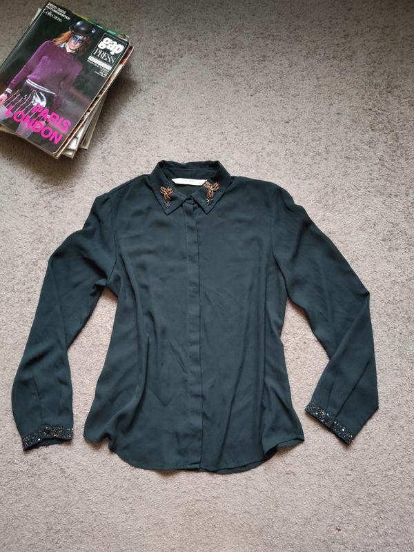 Базовая блузка Zara шифоновая на пуговичках Декорированная бисером Размер L Красивого темно-зеленого цвета emerald изумрудный Длинна рукава по внутреннему шву - 46 Длинна рукава от плеча - 59 Пот - 53 Пог - 54 Плечи - 40 Длинна по спинке - 62