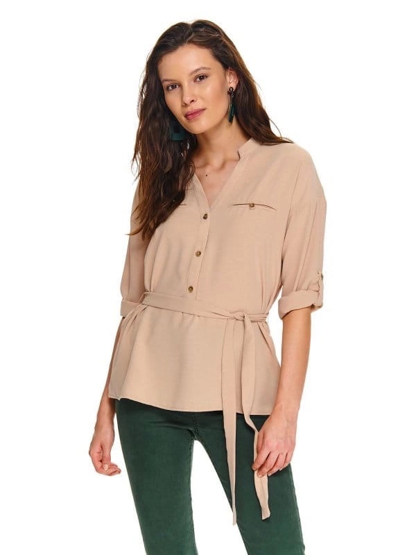 Жіноча сорочка цікавого крою з однотонної тканини. Вона частково застібається на гудзики, має V-подібний виріз і комірець-стійку. Сорочка з довгими рукавами, які можна загорнути і прикріпити, вона доповнена тканим поясом, який надає образу жіночності. Крій сорочки робить її ідеальною в поєднання з брюками і спідницею, в бежевому кольорі. 100% Поліестер Зріст моделі 175 см. розмір 34 Європ. (42-44): ДОВЖИНА 64 ДОВЖИНА РУКАВА 36 ПОЛОВИНА ОКРУЖНІСТЬ ДОЛУ 52 ПОЛОВИНА ОКРУЖНОСТІ ГРУДНОЇ КЛІТКИ 53 ПОЛОВИНА ОКРУЖНОСТІ ПАСКА 46 Усі розміри вказано в сантиметрах і вони можуть незначно різнитись від фактичних. СТИРАТЬ В ТЕМПЕРАТУРЕ ДО 30°C ДЕЛЕКАТНЫЙ ОТЖИМ В ЦЕНТРИФУГЕ НЕ ХЛОРИРОВАТЬ НЕ ПОДВЕРГАТЬ ХИМЧИСТКЕ НЕ СУШИТЬ В БАРАБАННЫХ СУШИЛКАХ