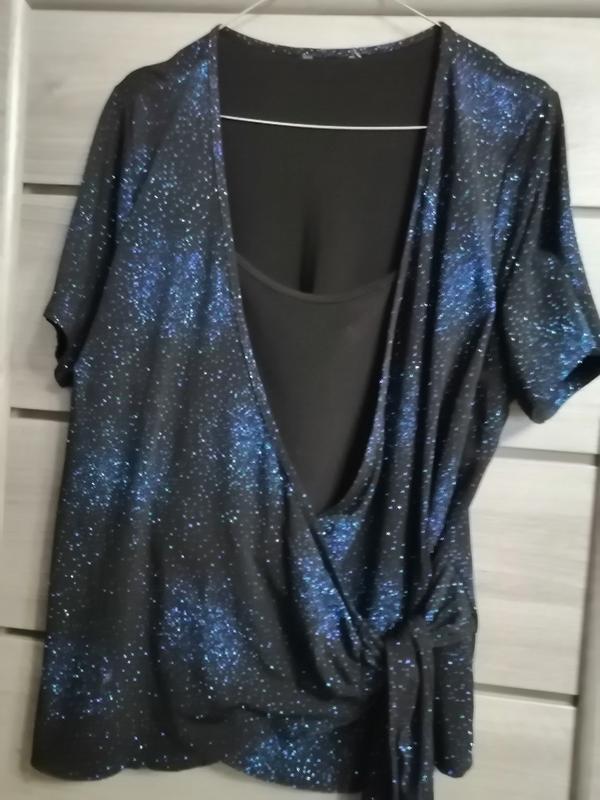 Нарядная блуза с люрексом, имитация майки чёрного цвета, с запахом. Длина 60,плечо 10,рукав 23,пог 52