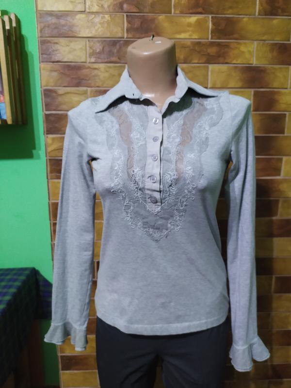 Очень милая блузка серого цвета. Ажур и воланы на рукавах облагораживают спорт. стиль. размер на xs/s. Состояние идеальное. Немного тянется.