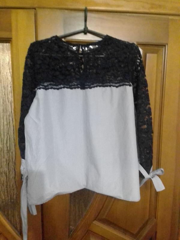 Блуза жіноча ZARA. РазмерL, але йде на M ,можливо на S(див. виміри). Етикетка з складом відсутня,але схоже на поліестер. Верхня частина мереживо темно синього кольору, низ тонка біло - синя смужка. Прикрасою служать зав'язки на рукавах. Верх рукава йде мереживний,низ в смужку.Заміри: довжина изделия61-62cm, 54см довжина рукава, пог 52см,низ55см.Ідеально виглядає під джинс.