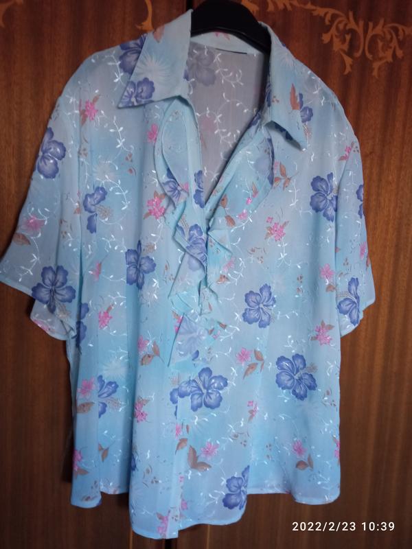 нежно голубая в цветочки и вышитые нежно голубым веточки,на пуговицах,с коротким рукавом,пог-64см, поб-65см, длина рукава-26см, полуокружность рукава-21см, длина блузы-70см.