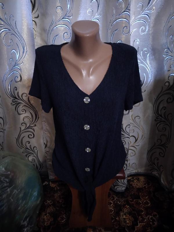 Стильная блуза с завязкой спереди F&F. Цвет - темно-синий. Размер - UK 14 EUR 42. Замеры: ПОГ 49-59 см, ПОБ 55-65 см, длина (без учета завязки) 66 см. Состав: 80% полиэстер, 19% вискоза, 1% эластан. В отличном состоянии
