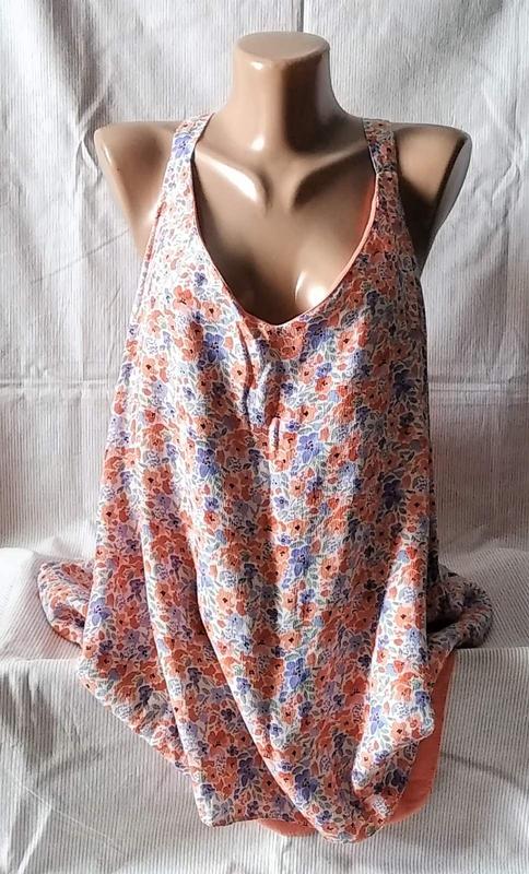 Двошарова,натуральна,з квітковим принтом. Всі виміри зроблені в спокійному (не розтягнутому) стані. ФОТО НА ТІЛІ НЕМАЄ. Довжина(по спині) 74 Завширшки(пахви) 63 Нова