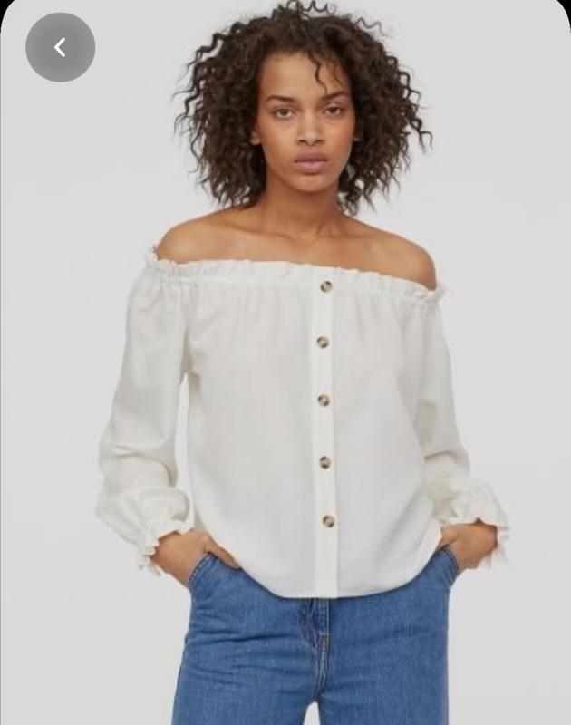 Замеры и фото вживую скину по запросу. Состояние новой вещи. Блузка с открытыми плечами из воздушной вискозной ткани с добавлением льна. Резинка и узкая оборка по верху. Декоративные пуговицы спереди и длинные рукава реглан с резинкой снизу и оборкой на манжете. Состав Вискоза 85%, Лен 15%