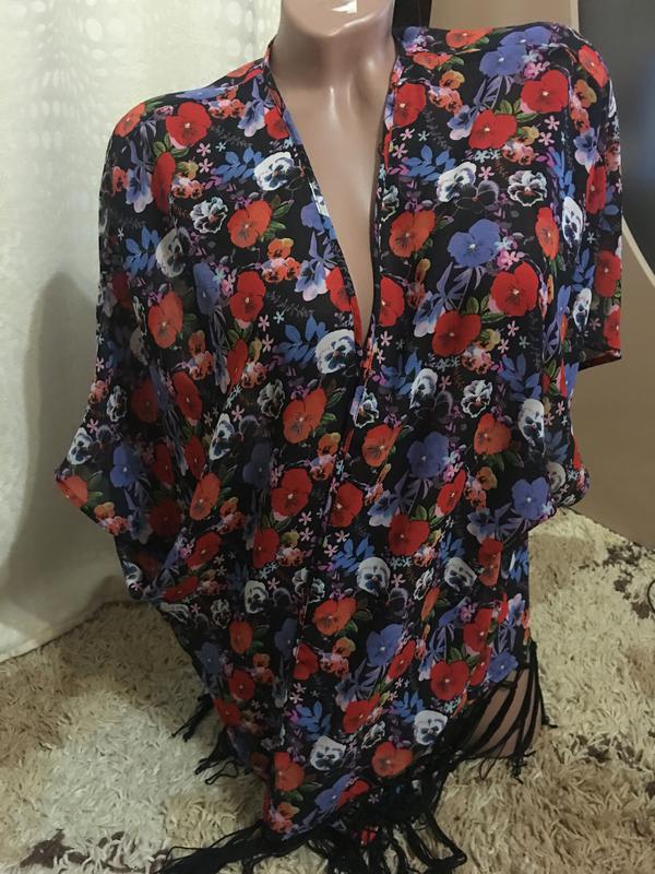 Шиаарная шифоновая накидка в яркие цветы с бахромой