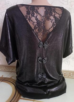 Святкова блуза з мереживною спинкою . Плечі спущені -вільно , ПІГ 57, ПІТ 46, довжина виробу 67 . Тканина трохи тягнеться , бірки зрізані .
