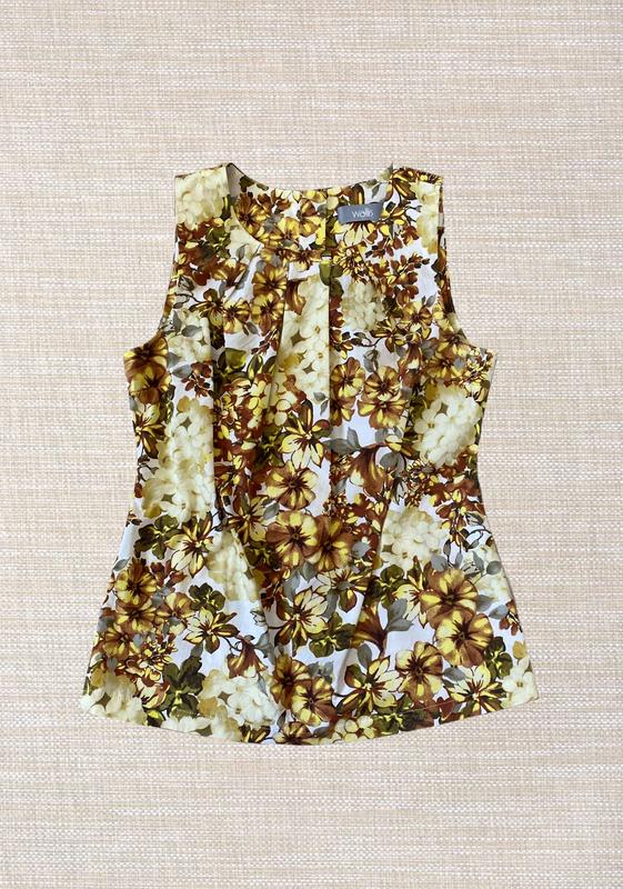 Жовтий топ в квітку, ззаду на ґудзиках. Стан нової речі, жодних дефектів. Натуральна тканина 95% котон, 5% еластан. Трохи тягнеться, ідеально сідає по фігурі, підкреслюючи талію і груди. Заміри: Ширина горловини 19 см ПОГ 39-42 см ПОТ 37-38 см Глибина пройми 21 см Довжина блузи 62 см