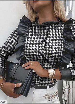 Блузка GC-5891 Розміри: 42-44, 46-48 50-52 54-56 Тканина костюмка + еко шкіра Стильна блузка на гудзиках, рюшик і стійка виконані з еко шкіри Виміри 42-44 груди 86, довжина 62,рукав 67 46-48 груди 94, довжина 63,рукав 67,5