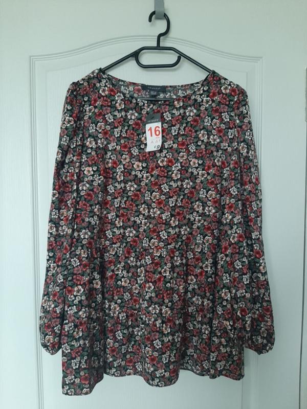 блуза с цветочным рисунком , 2-х ярусная, с длинным рукавом, расширенным книзу и присборенным. замеры: пог-54, длина рукава с плечом-56, длина-75, по нижней рюши-85