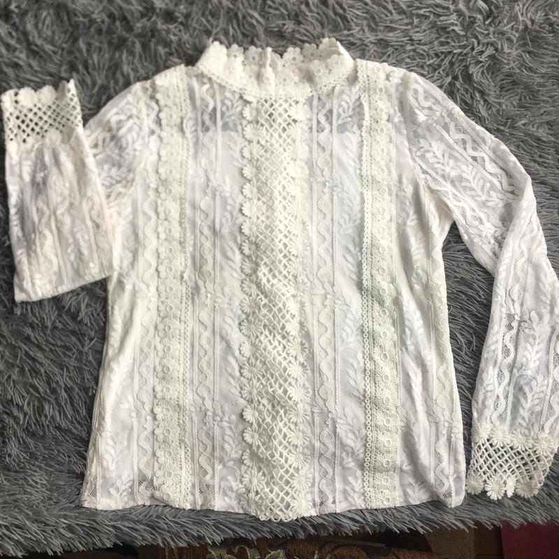 Гіпюрова блуза, стан відмінний, розмір Л, не тягнеться, воротник-стійка. Довжина 54, от 42, ог 45, рукав від плеча 57.
