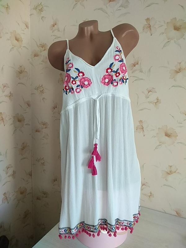 Невероятно красивая брендовая летняя блузка-туника на бретелях. Бретели регулируются. Белоснежная качественная жатая ткань, украшена красивейшей вышивкой гладью. Лиф на подкладке. Под грудью на завязках с кисточками, что позволяет прекрасно поддерживать грудь. По бокам небольшие разрезы. Низ украшают большие пайетки и шарики. Смотрится очень оригинально,эффектно и женственно. Состояние новой вещи без бумажной бирки. Следы носки отсутствуют. Дефектов нет.