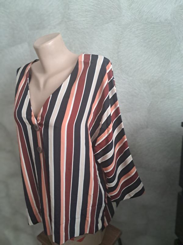 Легкая блуза, производство Шри-Ланка. Выглядит как стильный летний пиджак. Свободного кроя, на двух декоративных пуговицах. Не расстегивается (обманка). Спинка довше переду. Размер указан 16. С груди 62 см, талии и низа 59 см. Рукав 3/4. Ширина рукава в бицепсе - 17 см. Длина переда - 64, спинки 71 см.