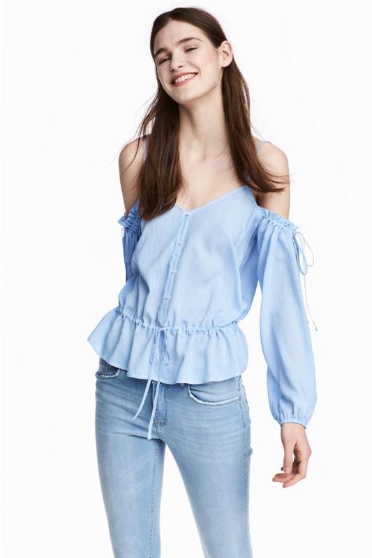 Блузка из воздушной ткани. На блузке треугольный вырез с узкими регулируемыми бретелями и открытыми плечами. Рукава длиной три четверти с резинкой снизу. На блузке застежка спереди, модель отрезная по кулиске на талии. Состав Вискоза 100% Размер указан 40/10 Пог 49 Длина 54 Рукав от подмышки 42 Ширина по низу 55