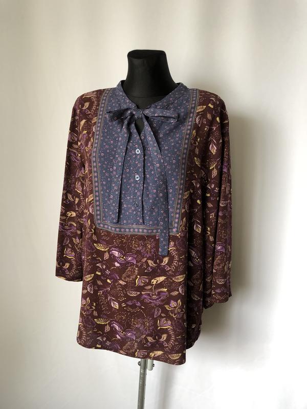 Блузка туника в цветочек этно бохо. Вискозный штапель, очень приятный. Этикетки срезаны, но есть пришитый металлический ярлык. Без нюансов. Длина 73-78 (спинка длиннее) Ширина 61-60-59 (грудь талия низ) Плечи 46 Рукав 48