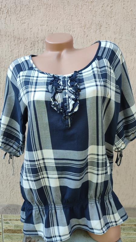 Цікава, вільна, натуральна блуза, з цікавим оздобленням на грудині, рукав спадний 3/4, вільний на зав'язках, знизу на резинці. рукав 39.5 внутрішній шов рукава 17 горловина 28 ПОГ 56 ПОТ 52 ПО резинки 44 ширина знизу 58 довжина 66
