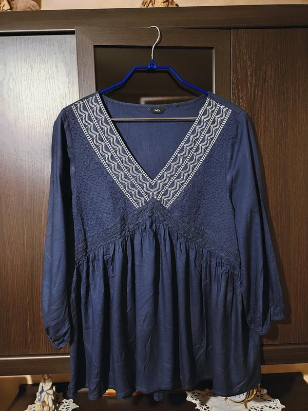 Стильная блузка от M&Co,в глубоком темно синем благородном цвете, размер указан 18, ориентироваться на замеры : плечи 45см, расстояние от подмышки до подмышки 56см,рукав 51см( 3/4), длина 73см,расстояние по вырезу(по плечам )27см. По крою свободная разлетайка ,рукав 3/4,декор впереди. Качество исполнения отменное. Состояние отличное,без следов носки,похоже новая, только без бирки. Состав на бирке, очень приятная на ощупь вискоза. Фото на теле нет. Делайте выбор осознанно, возврата и обмена нет.