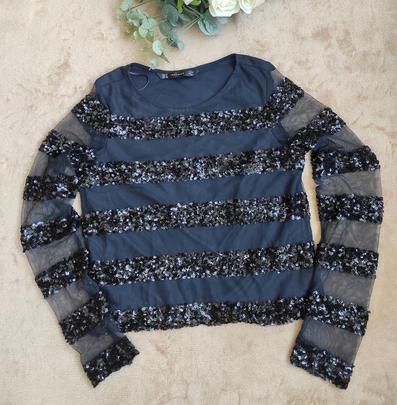 Неймовірно стильна і ніжна блузка темно-синього кольору з сіточкою та пайєтками. Буде добре комбінуватись як зі спідницею , так і з класичними брюками.
