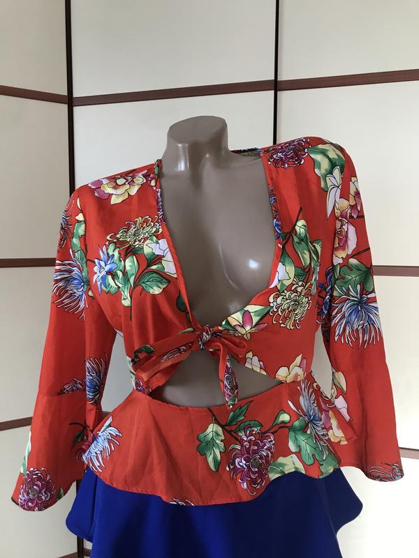 Красива яскрава блуза,розмір М-L(вказаний 12)довжина 48см,пог 51см,піт 39див,збоку замок,є невеличка затягування ,видно на останньому фото